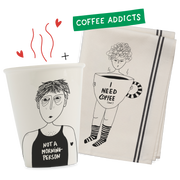 Het perfecte cadeau voor mensen die hun dag niet kunnen starten zonder een kop koffie! Cadeauset met beker not a morning person en keukenhanddoek coffee now